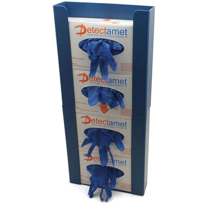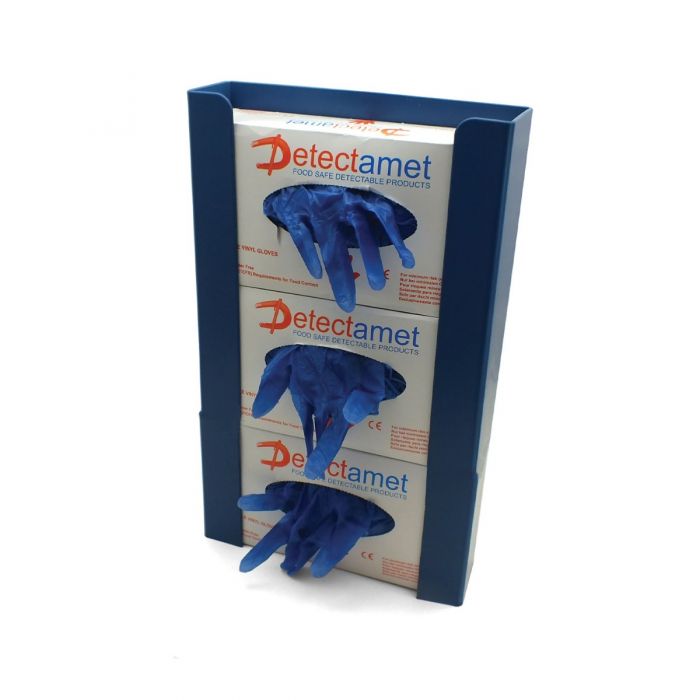 Caixa dispensadora de luvas em plástico detetável pode conter uma capacidade até quatro caixas de luvas. É composta por material detetável e visível por raio-x.